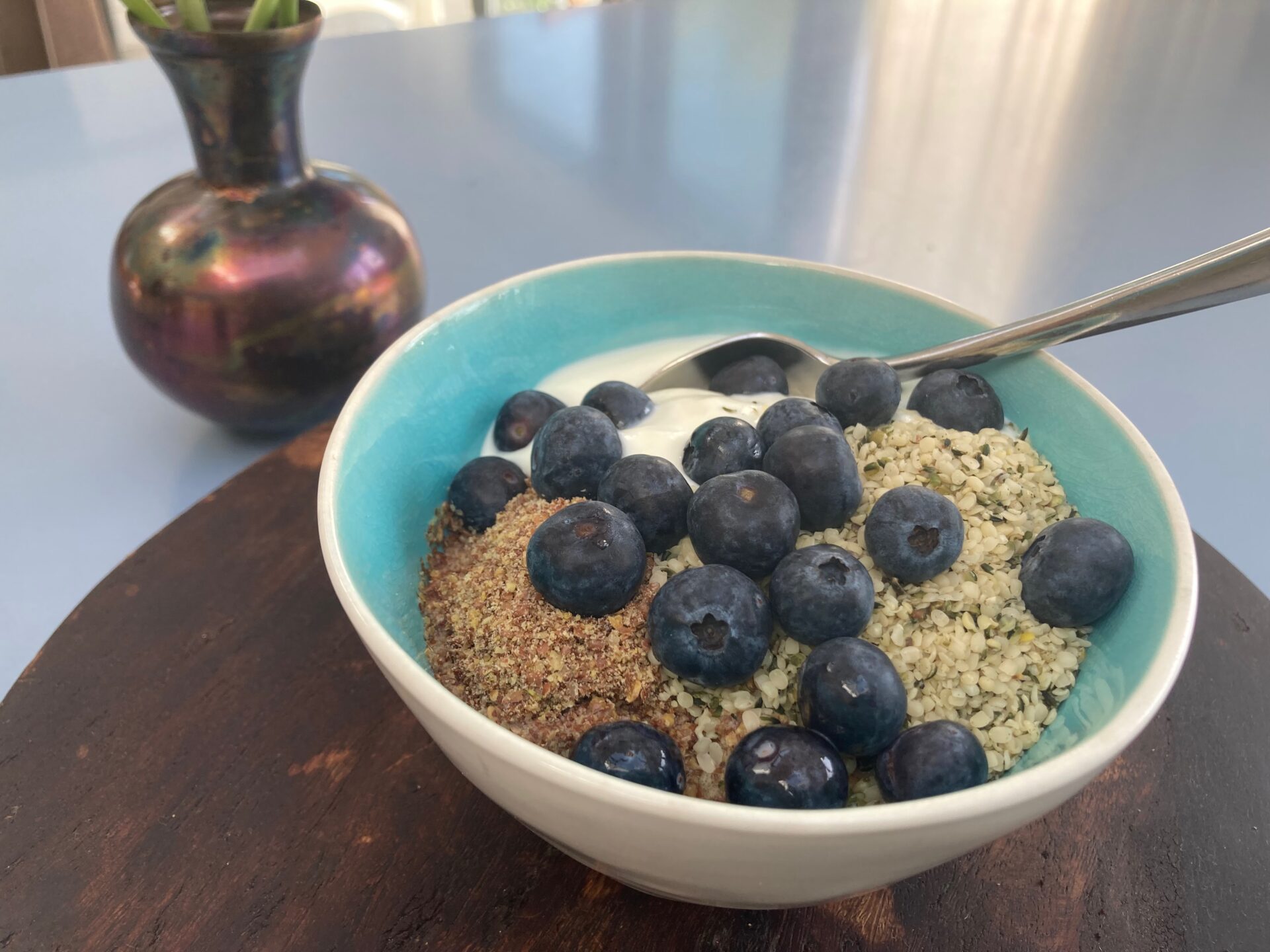 The whisked egg whites give this granola the crunch but you could use coconut oil instead. If you are transitioning to a less sweet and lower carbohydrate diet you could add 2 tbsp of maple syrup then reduce this as your taste buds adjust. There is no sugar or dried fruit in this granola and it has cinnamon which helps to regulate blood sugar, so it’s quite a decent option for stable blood glucose levels. However it is still baked and crispy food produces ‘advance glycation end-products’ which are linked to ageing. So go easy and keep this for travelling, morning emergencies or have it as a healthier pudding. I served it with yogurt, ground flaxseed and hemp seed plus a few blueberries.